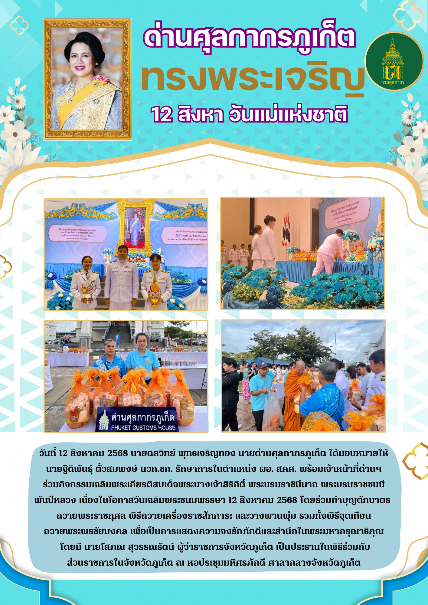 ด่านศุลกากรภูเก็ตร่วมกิจกรรมเฉลิมพระเกียรติสมเด็จพระนางเจ้าสิริกิต์ พระบรมราชินีนาถ พระบรมราชชนนีพันปีหลวง เนื่องในโอกาศวันเฉลิมพระชนมพรรษา 12 สิงหาคม 2568